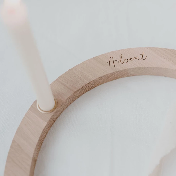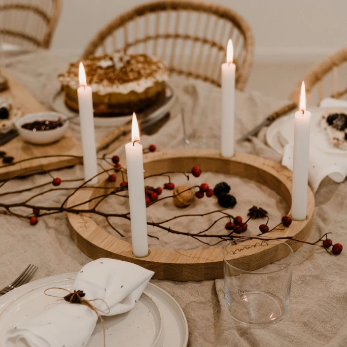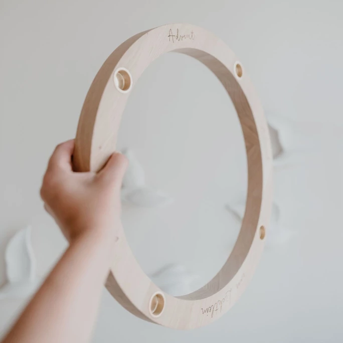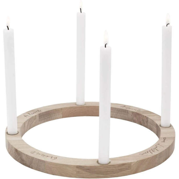 Mit dem stilvollen Adventskranz von Eulenschnitt schaffen Sie eine gemütliche Atmosphäre in Ihrem Zuhause und verbreiten damit garantiert eine harmonische Weihnachtsstimmung. Er ist mit dem besinnlichen Spruch Advent, Advent, ein Lichtlein brennt an der Oberseite liebevoll verziert und sorgt so für einen dekorativen Eyecatcher. Der runde Kerzenständer besticht durch sein schlichtes Design, wodurch er sich in nahezu jeden Einrichtungsstil problemlos integrieren lässt. Der Adventskranz ist aus Eichenholz gefertigt und mit vier goldenen Kerzentüllen ausgestattet. Hier finden Stabskerzen mit einem Durchmesser von 2,2 cm bequem Platz. Diese sind nicht im Lieferumfang mit enthalten. Wir bieten Ihnen weitere Wohnaccessoires von Eulenschnitt in unserem AMBIENDO Shop an. Genießen Sie die Advents- und die Weihnachtszeit, mit dem stilvollen Adventkranz aus dem Hause Eulenschnitt!