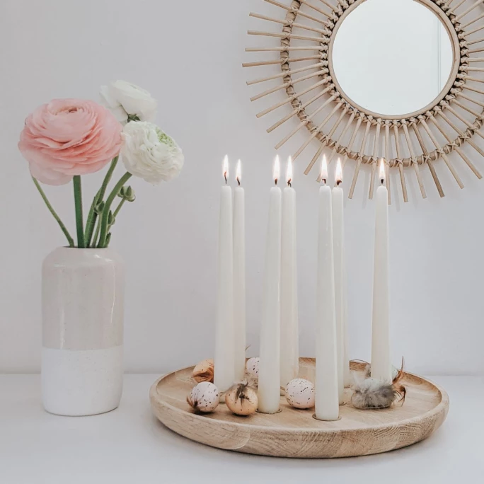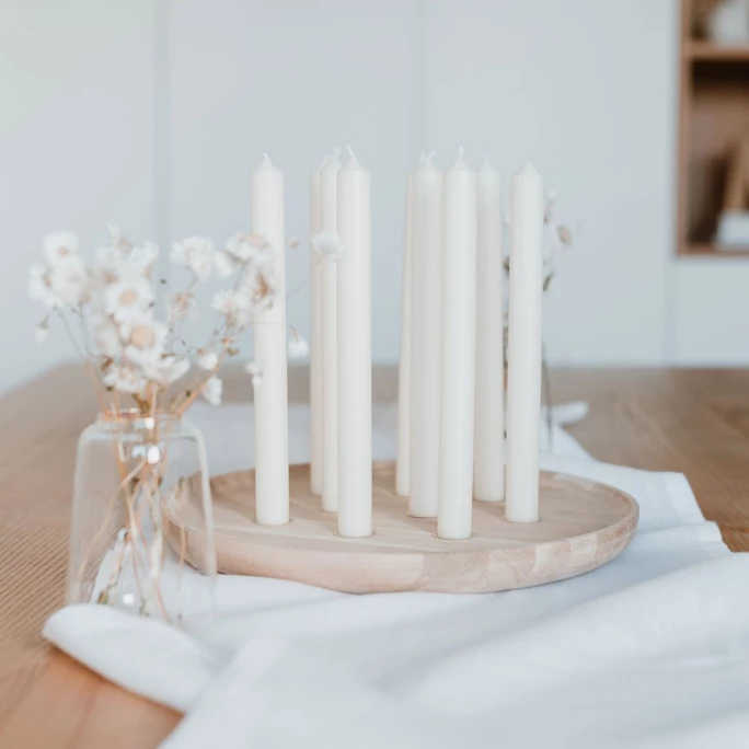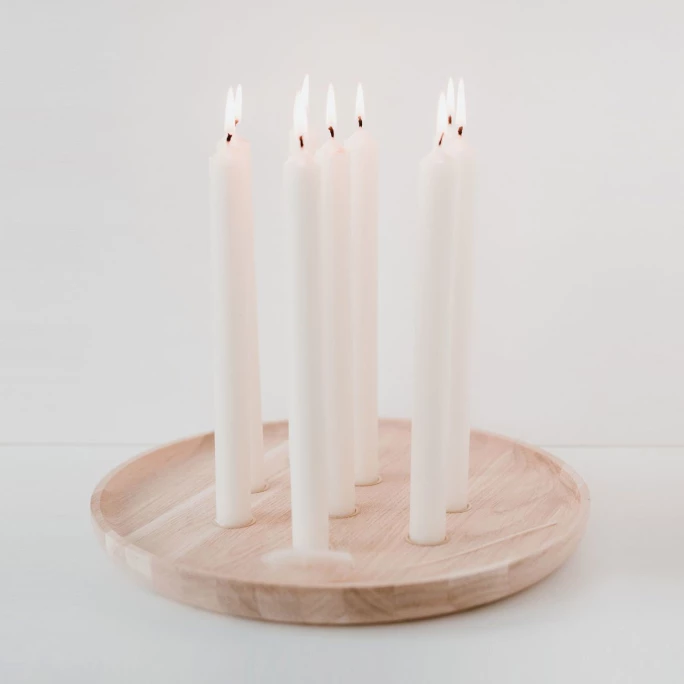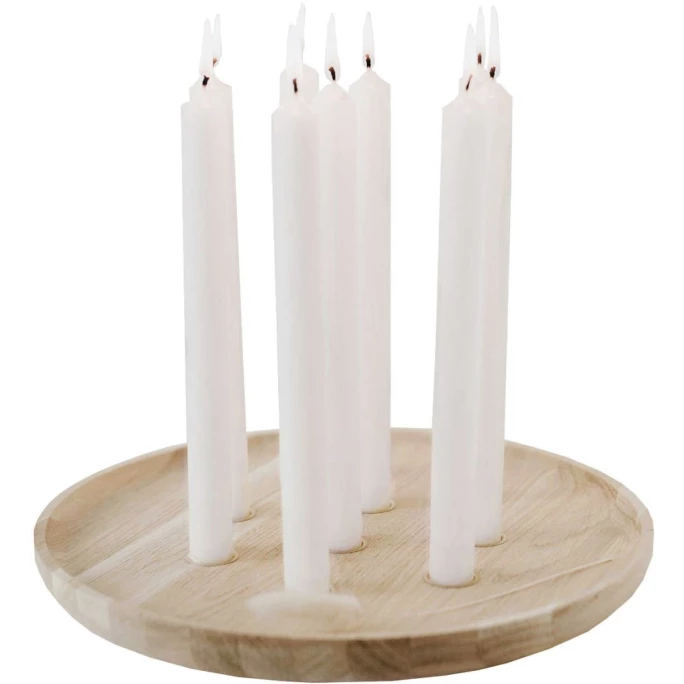 Mit dem eleganten Kerzenbrett von Eulenschnitt schaffen Sie eine gemütliche Atmosphäre in Ihrem Zuhause. Es beeindruckt durch die runde Form und die angenehme Größe, wodurch sich viele schöne Dekorationsmöglichkeiten ergeben. Das Brett ist aus Eichenholz gefertigt und mit neun goldenen Kerzentüllen ausgestattet. Hier finden Stabkerzen mit einem Durchmesser von 2,2 cm bequem Platz. Diese sind nicht im Lieferumfang mit enthalten. Das Brett besticht durch das schlichte Design, wodurch es sich in nahezu jeden Einrichtungsstil problemlos integrieren lässt. Wir bieten Ihnen weitere Wohnaccessoires von Eulenschnitt in unserem AMBIENDO Shop an. Genießen Sie besinnliche Stunden mit dem stilvollen Kerzenbrett aus dem Hause Eulenschnitt!