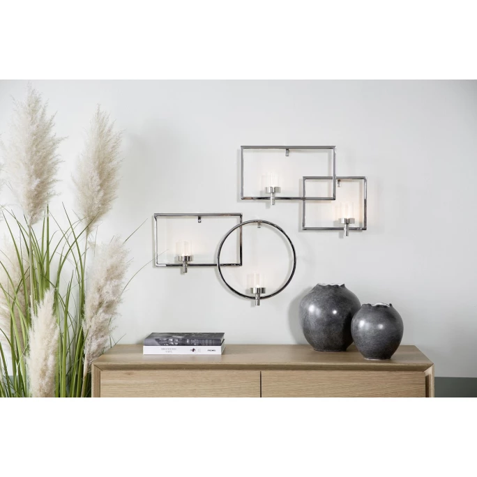 Der Wandkerzenhalter Escala aus dem Hause Fink kombiniert minimalistisches und klares Design mit verträumten Kerzenschimmer. Harmonisch aufeinander abgestimmte geometrische Formen fügen sich zu einer modernen Wanddekoration zusammen. Mit Teelichtern bestückt bringt Escala eine gemütliche Atmosphäre in Ihr Zuhause. Das hochwertig veredelte und pflegeleichte Metall verleiht dem Wandleuchter einen beeindruckenden Glanz, der die elegante Optik unterstreicht. Jedes einzelne Stück wird in aufwendiger, traditioneller Handarbeit gefertigt. Bestellen Sie den schicken Escala Leuchter aus dem Hause Fink und entdecken Sie auch die weiteren Lifestyle-Produkte der Qualitätsmarke!