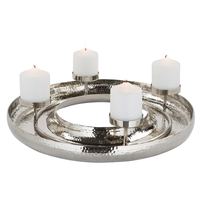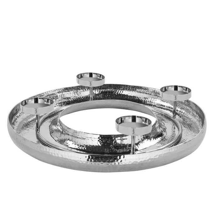Passende Dekoration für jede Jahreszeit – der Kranz der Kollektion FLEX von Fink sorgt überall für eine schöne Atmosphäre. Er besteht aus glänzendem Metall, in dem sich das Licht kunstvoll bricht. Besonders schön ist die gehämmerte Optik der Schale. Im Inneren befinden sich etwas erhöht vier Kerzenhalter, die für Stumpenkerzen oder Teelichter geeignet sind. Sie sind miteinander verbunden und lassen sich mit oder ohne Glas verwenden. Der Dekokranz FLEX passt zu jedem Wohnstil und fügt jedem Raum ein stilvolles Accessoire hinzu. Die vier Kerzenhalter können flexibel herausgenommen werden, sodass die Schale auch alleine verwendet werden kann. Der Kranz ist in verschiedenen Größen erhältlich und lässt sich vielfältig dekorieren. Bestellen Sie den schicken Kerzenkranz aus dem Hause Fink und entdecken Sie auch die weiteren Lifestyle-Produkte der Qualitätsmarke!