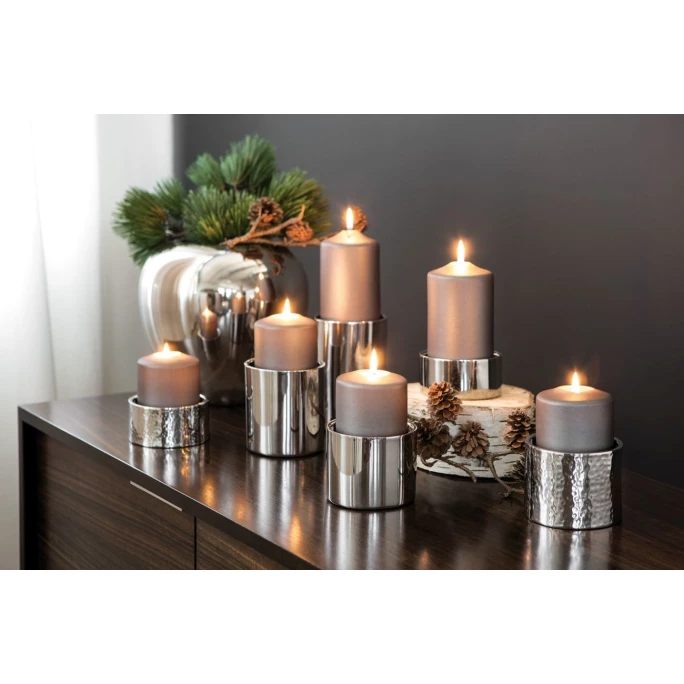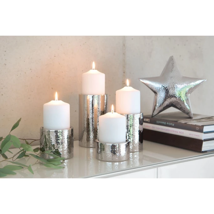 Mit ruhigem Kerzenschimmer schaffen Sie mit wenigen Handgriffen kuschelige Gemütlichkeit in Ihren vier Wänden. Ob dezentes Licht zum gemütlichen Fernsehabend oder warmer Schein zum festlichen Anlass: Diese Stumpenkerzenhalter aus der Serie SOBRIO von Fink sind sowohl alltagstauglich als auch elegant und edel. Es sind unterschiedliche Größen erhältlich, die sich zu faszinierenden Lichterinseln arrangieren lassen, aber auch einzeln platziert faszinierende Dekorationsakzente setzen. Der hochwertige, glänzend polierte Edelstahl mit dezenter Hämmerung reflektiert die Farben und Lichter der Umgebung und fügt sich so harmonisch in jedes moderne Wohnambiente ein. Jedes Objekt wird mit viel handwerklichem Geschick hergestellt und erhält auf diese Weise seinen eigenem Charme. Bestellen Sie den hochwertigen Kerzenhalter SOBRIO aus dem Hause Fink und erfreuen Sie sich immer wieder an Qualität und Design!