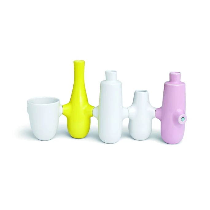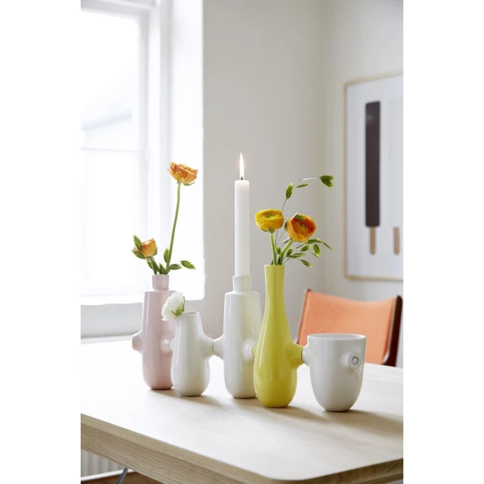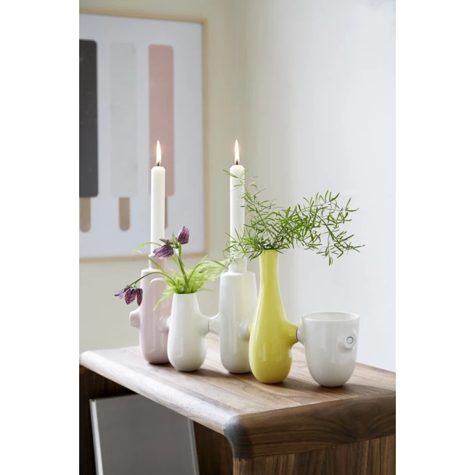 Kähler Design ist ein traditionsreiches Unternehmen aus Dänemark, welches seit 1839 besteht und zum dänischen Kulturgut zählt. Mittlerweile ist die Marke weltweit bekannt und sehr beliebt für die klassischen sowie stilvollen Stücke. Die kreative Serie Fiducia wurde von der Designerin Louise Campbell entworfen. Das stimmungsvolle Kerzenhalter- und Vasenset aus der gleichnamigen Serie Fiducia beeindruckt durch das verspielte Design. Das Set besteht aus fünf unterschiedlichen Elementen, welche durch die magnetische Verbindung an den Seiten eine Vielzahl von Kombinationen ermöglicht. Nicht nur die Zusammenstellung kann variieren, sondern auch die Anzahl der verwendeten Einzelelemente ermöglicht unterschiedliche Arrangements. Das Zusammenspiel der runden Formen und der verschiedenen Farbkombinationen sorgen für einen modernen Ausdruck dieser exklusiven Serie. In den Gefäßen kommen Stabkerzen, Blüten, Blumen oder Gräser besonders gut zur Geltung und können damit dekorativ in Szene gesetzt werden. Auch ohne Dekoration macht das Kerzenhalter- und Vasenset eine wunderbare Figur und sorgt für einen aufregenden Eyecatcher. Das Kerzenhalter- und Vasenset Fiducia von Kähler besteht aus hochwertigem Keramik und ist mit einer leicht glänzenden Glasur versehen. Überzeugen Sie sich von diesem ausgefallenen Wohnaccessoire mit seinen multifunktionalen Möglichkeiten!