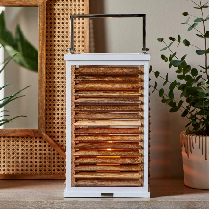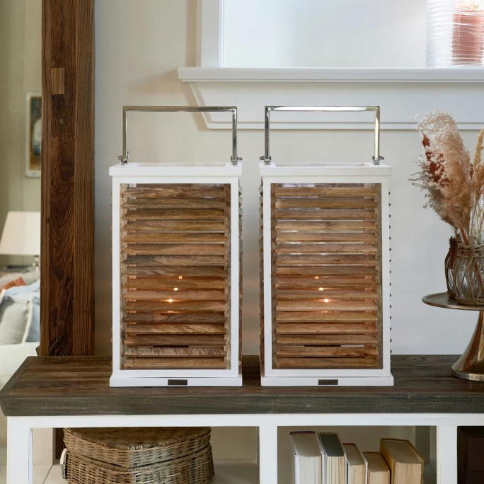Die gut 40 cm hohe Ocean Cay Laterne von Rivièra Maison dosiert das Kerzenlicht mit Lamellen aus Mangoholz. Durch die Verwendung dieser besonderen Holzsorte ist es möglich, dass jede Lamelle ein etwas andere Farbe hat als die Lamelle darüber oder darunter. Dies verleiht dem Rivièra Maison Windlicht einen außergewöhnlichen Look. Die Glasscheiben auf der Innenseite von Ocean Cay schützen die Kerze vor dem Wind. Lassen Sie sich von dem tollen Look begeistern und sorgen mit der Ocean Cay Laterne von Rivièra Maison für eine stimmungsvolle Lichtatmosphäre im Haus oder auf der Terrasse!